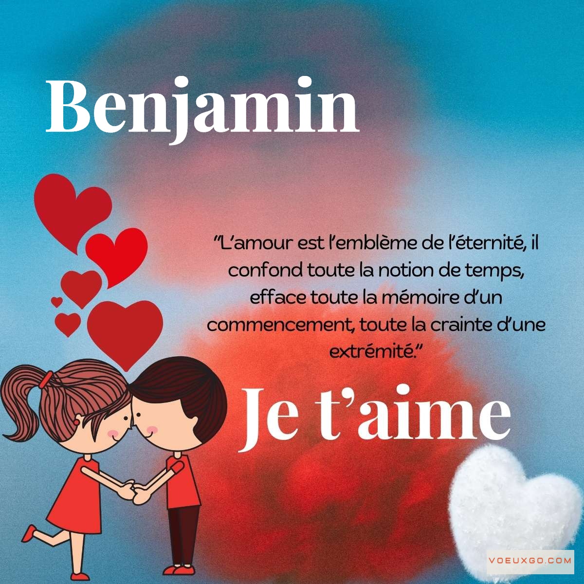 L'amour s'exprime chaque jour, mais pourquoi ne pas surprendre l'élu(e) de votre cœur avec une déclaration d'amour personnalisée unique ? Que ce soit pour créer une carte Saint-Valentin au prénom de votre partenaire, murmurer un tendre 'Je t'aime' ou combler la distance avec un délicat 'Tu me manques', notre créateur de messages romantiques transforme vos sentiments en images mémorables. D'une simplicité absolue, il suffit d'indiquer le prénom pour voir apparaître instantanément votre carte d'amour personnalisée. Toutes nos créations, libres de droits et entièrement gratuites, peuvent être partagées sur vos réseaux sociaux ou envoyées directement à votre bien-aimé(e) pour créer un moment d'intimité privilégié même à distance.